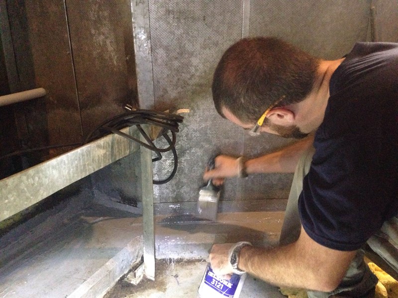 Problem: The air handler condensate pan was leaking water. Corrosion had allowed for water to push underneath the pan and out between the pan and concrete pedestal. This was the result of a previously applied competitor's coating in the pan and around the bottom seam disbonding.