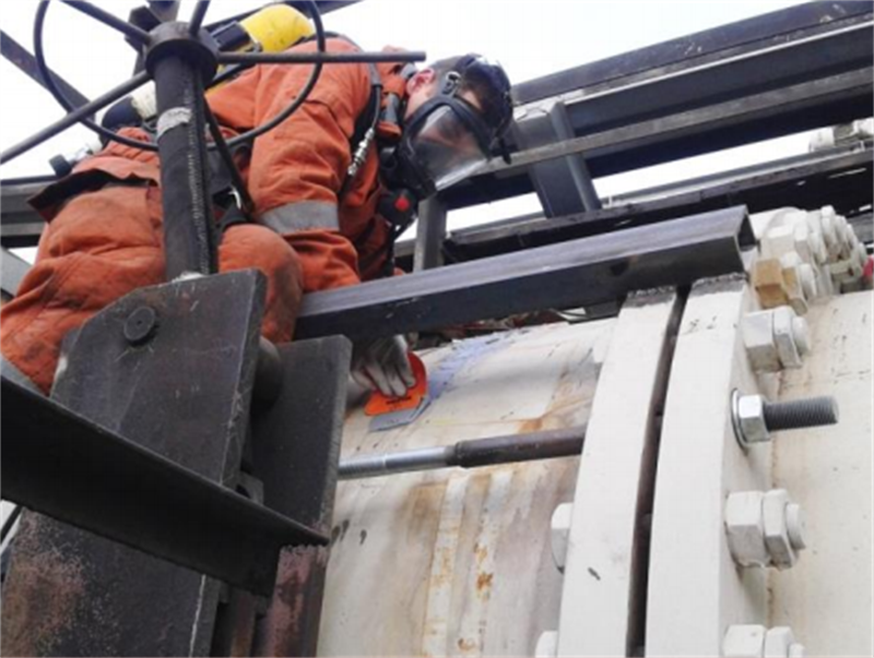 Problem: Pipeline had developed a crack which was leaking gas into the atmosphere. The repair had to be performed live. The intake pipe had a diameter of 2,000mm and had developed a crack 2,500mm long and 2mm wide.