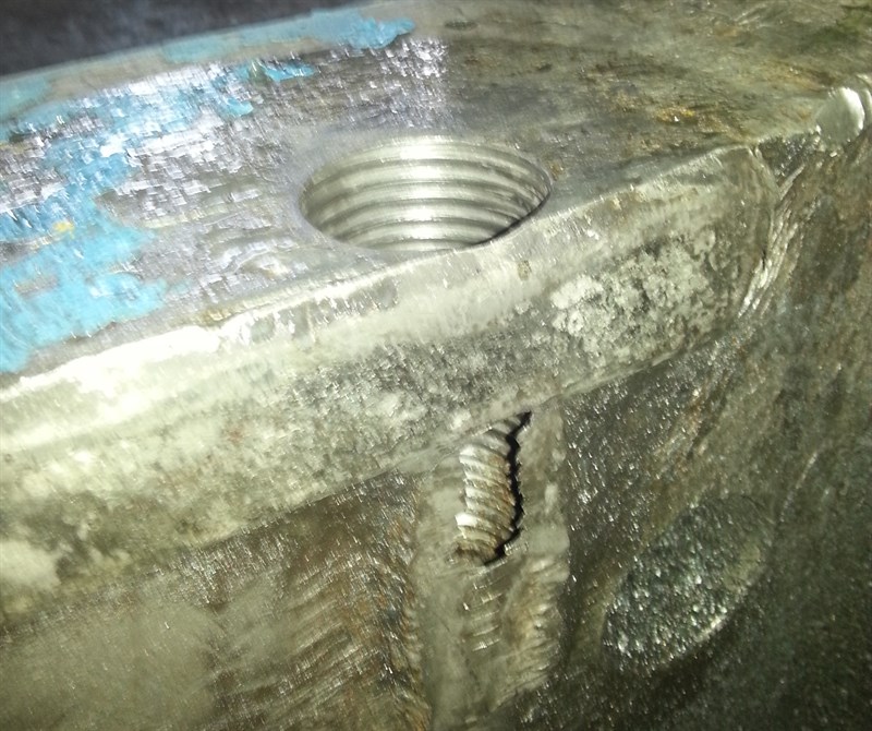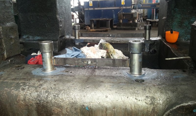 Problem: Lower bolster was not held securely due to loose fixing bolts. This led to misaligned die sets as the press hammered out parts. The movement was so severe that nearly 100% of production on this press was considered scrap and the company were considering a very expensive replacement. In addition it was found that the walls of the threads were holed and welding was impossible.