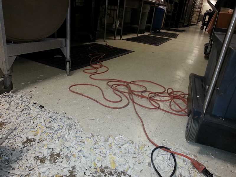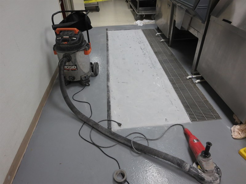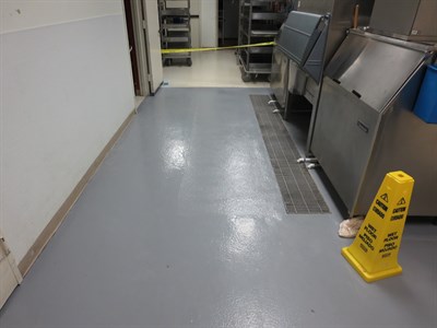 Problem: The VCT square tiles were coming up with the water dripping on them from the ice machine, causing a sanitary and slipping problem.