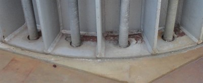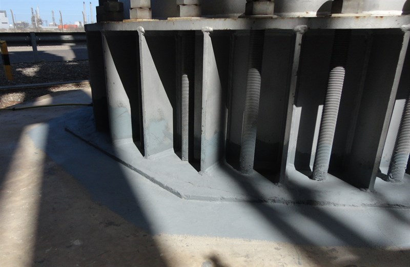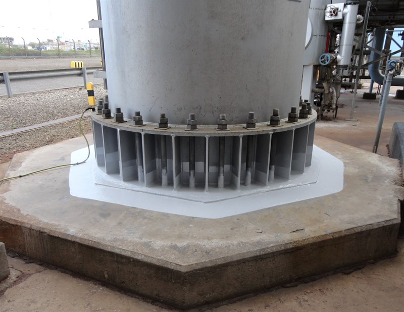 Problem: This hydrogen flare stack had recently been installed on site, but gaps around the “hold down bolts” had resulted in water ingress to the underside of the stack. Several solutions were considered, but with 28 bolts and fins to accommodate, the obvious choice was a Belzona Tank Base Seal solution.