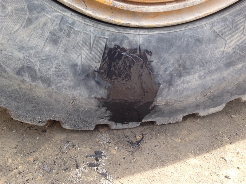 Problem: A large crack approximately 10 inches long and up to 2 inches deep had developed. There was no spare tire and removing it for vulcanization would leave the operation short of their only loader. This loader was used to supply materials for the entire block plant and without it, the entire operation is down. The deep crack was exposing radial belting and needed something to stop the moisture from attacking the steel radials and keep the crack from running further.