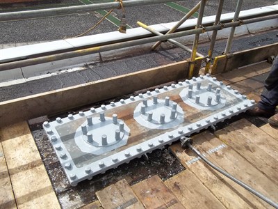 The application was carried out in accordance with modified versions of Belzona Know-How System Leaflets VPF-8 & 11. The tertiary box substrate was prepared before Belzona® 1221 was used to stem any active oil leaks. The flange joint was sealed using Belzona® 1161 incorporating Belzona® 9341 (Reinforcing Tape). Bolt and nut heads, together with male studs were protected by either bridging tape or tight fit former, then fully encapsulated using a disposable former containing Belzona® 1161. Following the curing process, the formers were removed and all of the repair areas were coated with Belzona® 5831.