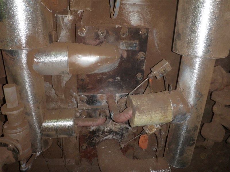 1. Insulation stripped to expose the area; the plates vary from 200°F to 330°F and the exposed piping is over 450°F. 2. The leak is coming from behind the center plate, especially the end at the LH side. 3. Completed application; the center plate is sealed. Please note the Belzona product on the left end of the plate where a bolt was inserted and extra material was required to seal this live leak of hot SO2 gas.