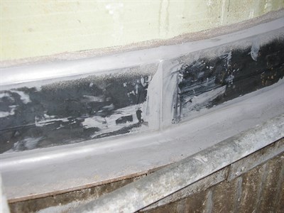- The Belzona repair. After surface preparation to acheive profile the profiled plates were bonded in place with a fillet of Belzona material between them to allow excess water to run off.
