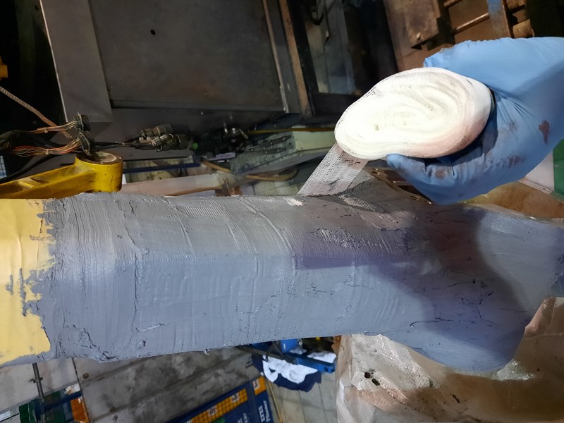 After proper surface preparation, the application was carried out by putting the metal plates with screws on the broken arm. Belzona 1111 was applied between the two pieces of metal right on the tear of the pieces. After bonding the two pieces of the arm, the reinforcement sheet (Belzona 9341) was wrapped around the entire damaged area, which was wet out with Belzona 1111.