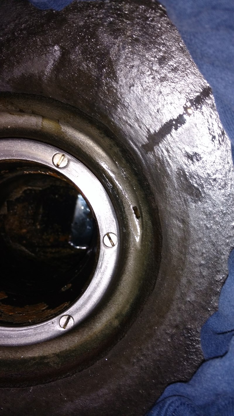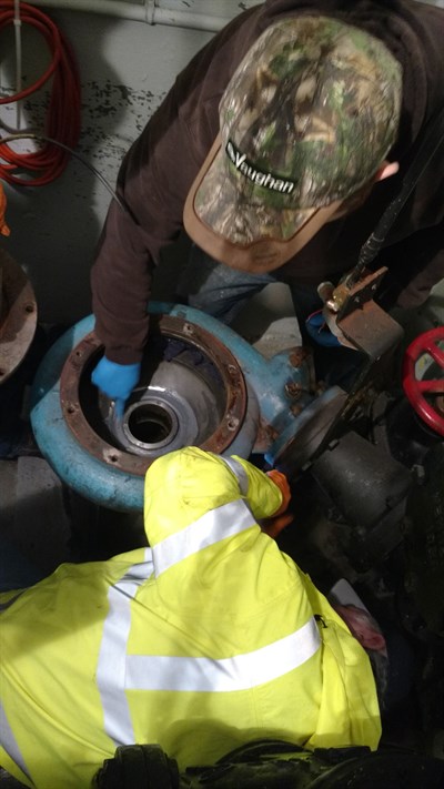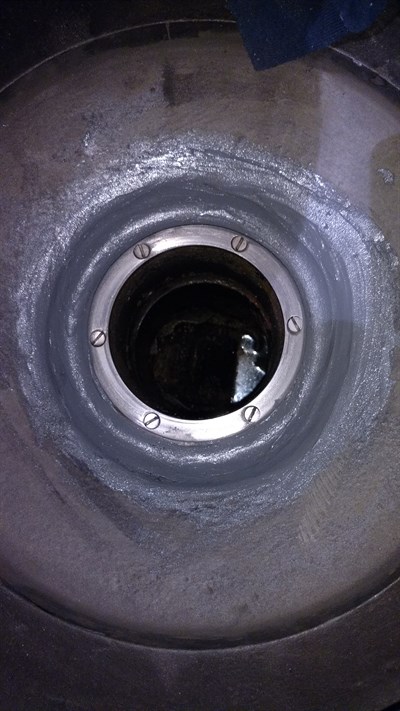Problem: There was a hole worn underneath the impeller on the volute from "rags" in the wastewater system getting caught. This allowed for raw wastewater to leak from the pump into the underground vault which is located next to a large lake.