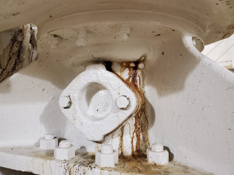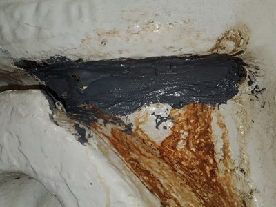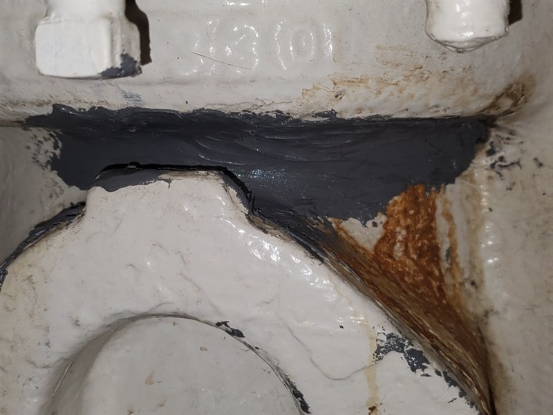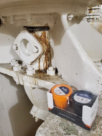 The location of the faulty weld was tight and difficult to reach, but a dremel tool was able to just reach in and remove the paint and corrosion and roughen the surface. During the application the pump was not running, but there was still a small amount of water pressure causing a slow seeping drip. Belzona 1212 was mixed according to the IFU and allowed to sit on the mixing board until only 45 seconds of working life was remaining. Then the 1212 was quickly applied over the active seep and pushed into place by hand. This slowed the seep considerably, and one final batch of 1212 was mixed and applied in the same manner which stopped the leak completely.