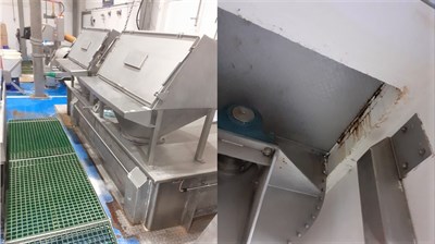 Floor set ribbon mixers are loaded with un-mixed product from the top and mixed product is released into a bin situated under the mixer on the floor below. A thorough washdown is done between each batch and periodically the side checker plates have to be removed for maintenance, then replaced and resealed.