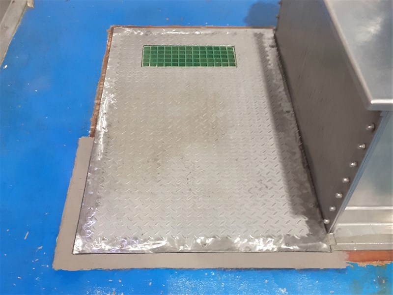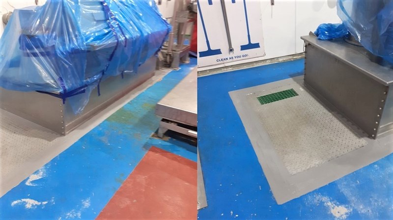 Belzona 4911 Conditioner & 4131 Magma Screed was used to bring the floor flush to the edge of the floor plates, to remove the "leading edge" that would take the brunt of the damage when pallets were placed next to the mixer. Belzona 3121 (MR7) was used to make a sealing membrane around the mixer after grinding off the checker pattern around the edges of the side plates