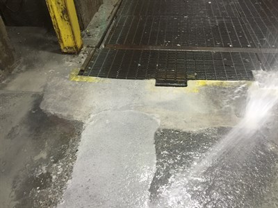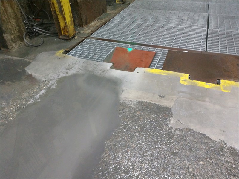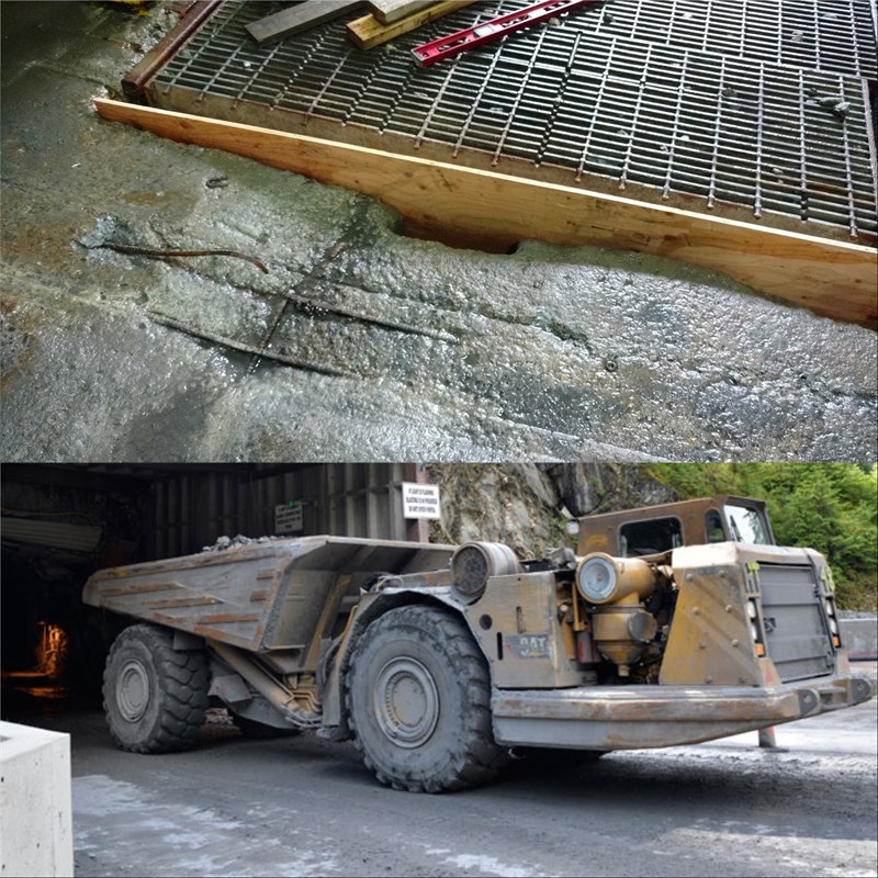 Problem: Extremely deep wear in the concrete floor in the tread areas of this wash bay. Full mine haul trucks roll across this floor year round with cleated tire chains. The deep ruts were being covered with heavy steel plates. Both the ruts and steel plates were causing a hazard to the crew when walking in the area.