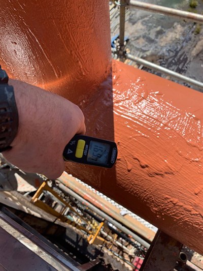Wall thickness readings were taken prior to any work being completed. Belzona 1511 was used to rebuild thin wall defective areas prior to the application of Belzona 5871. Due to non-sparking requirements onsite, the substrate was prepared using MBX bristle blaster and wire brushing.