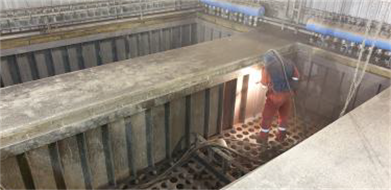 Abrasive grit blasting, dust removal of wall surfaces and bag filter sieves. Then a Belzona 5892 two coat system was applied.