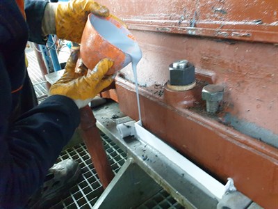 In accordance with Belzona system leaflet GSS-12: 1. Unscrew the covers engine. 2. Turning the shaft into check the settings shaft (taking measurements when rotating the shaft, the so-called Springing the shaft) 3.Loosening the screws and screwing in spacer bolts, breaking up the old ones shims 4. Cleaning places of performance (pouring out) new washers 5.Preparation and sealing formwork for pouring Belzona 7111 6 Pouring out of Belzona 7111 7. Removal of formwork and tightening the screws with a force of 1100 Nm