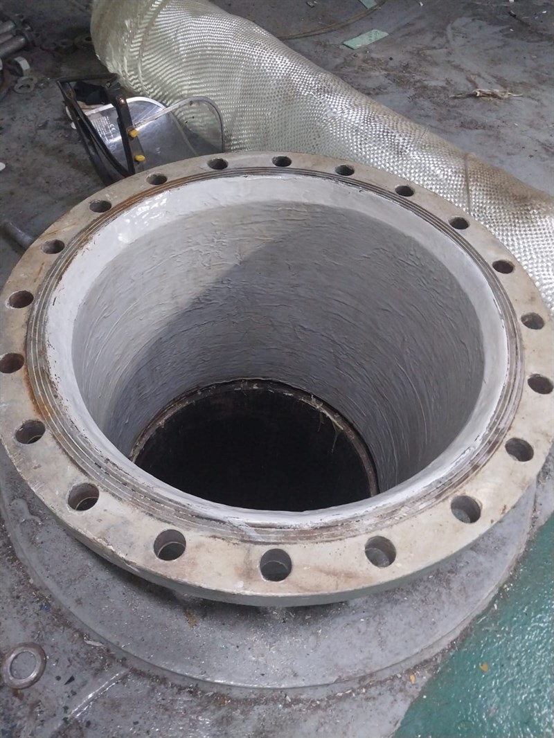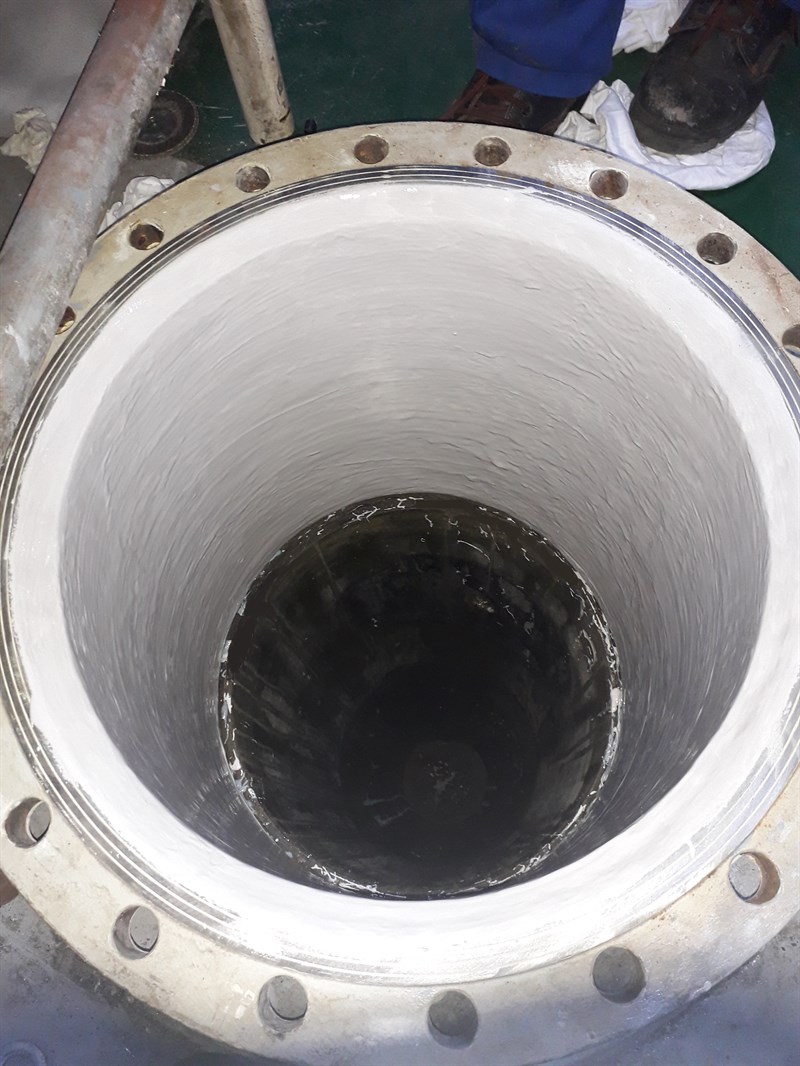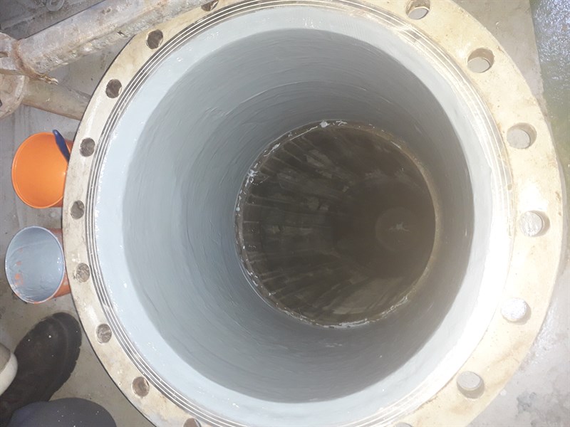 The application was carried out in accordance with Belzona System Leaflet VPF-02 and TCC-05. The surface was prepared and cleaned. Two layers of Belzona 1391T were applied to coat the internal surface of the steel pipe for protection against further corrosion and cavitation damage. After completion of the coating application, post cure has been applied according to the IFU.