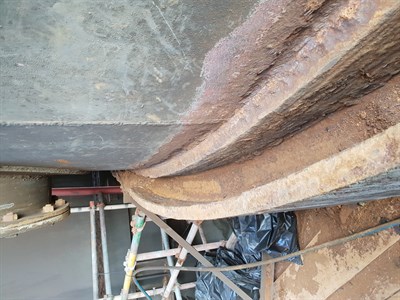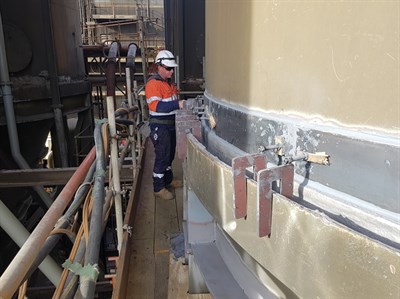 The application was carried out by Cold Bonding 200mm x 1m rolled plates with Belzona in accordance with the Method Statement for Cold Plate Bonding. After abrasive blasting, all corrosion holes were first repaired by filling with Belzona 1111. Belzona 1111 was then applied to the plates which were bonded into place. Belzona 1121 was used when temperatures rose above 35 C to allow more working time.