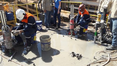 First, 48 new holes were drilled to install newly fabricated bolts. Then the skid was positioned over the concrete base, secured and aligned with 4 metal bars in 4 points around the perimeter of the skid, and positioned on top of the concrete base. Belzona 4111 and Belzona 4151 were then mixed and injected into each of the holes. Anchor bolts were inserted, and excess of product was used to fill the annular space under the equipment.