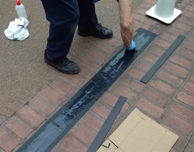 1) Joint edges ground and cleaned to remove old adhesives and loose material 2) Joint edges taped and conditioned 3) Application in process 4) Application completed