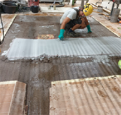 Problem: Downtime was a big factor. Time given for the whole project of dissassemble the old equipment, building new foundation and assembling the new equipment was 5 days. Disassembly took 2.5 days due to some difficulties, and the assembling, including adjustments of the equipment needed 2 days, so the foundation needed to be ready for assembling on Thursday morning. Time given for preparing, building and top-coating was finally only from Wednesday 15:00 to Thursday morning 07:00. During this time also the Top-Coat needed to be ready for light loading and light pedestrian footfall.