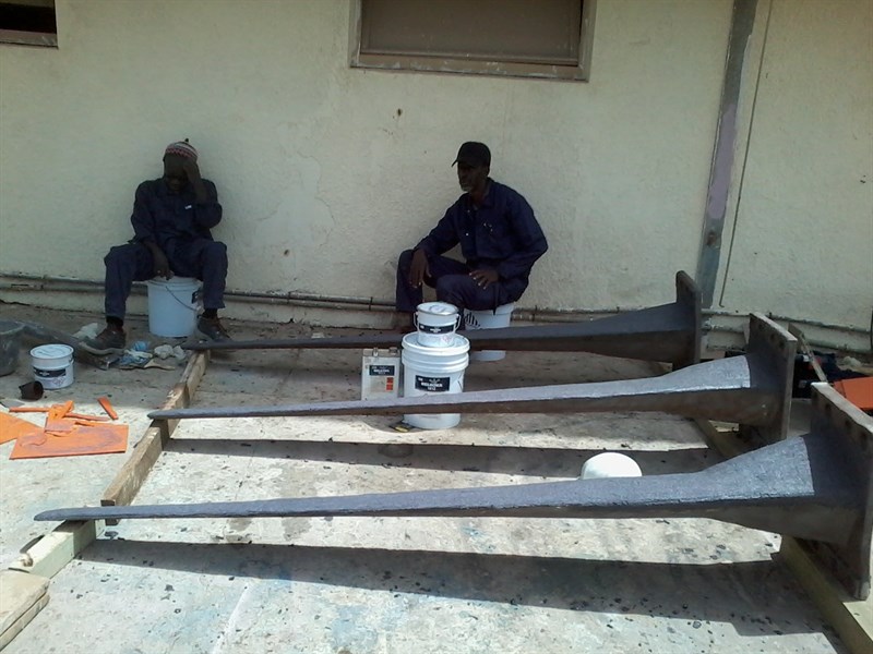 After removing the remainder of the rubber coating, the blades were welded on the heavily damaged areas. The surface was then grit-blasted before the application of Belzona 1812 according to the SHM-13 Belzona procedure.