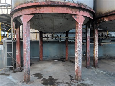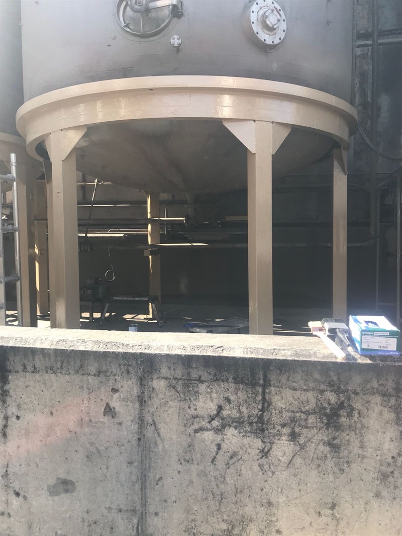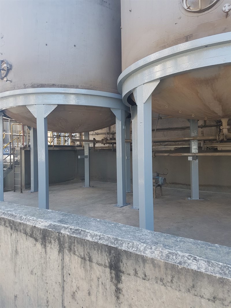 Several tank legs were experiencing corrosion. Around distillation sites a specific fungus that feeds from ethanol grows. This fungus creates a rough surface that traps water against a surface. This particular distillery is close to the sea, meaning much of this water would have salt within it. The combination of these two factors gives great potential for the corrosion of any unprotected metal.