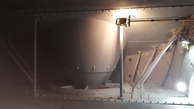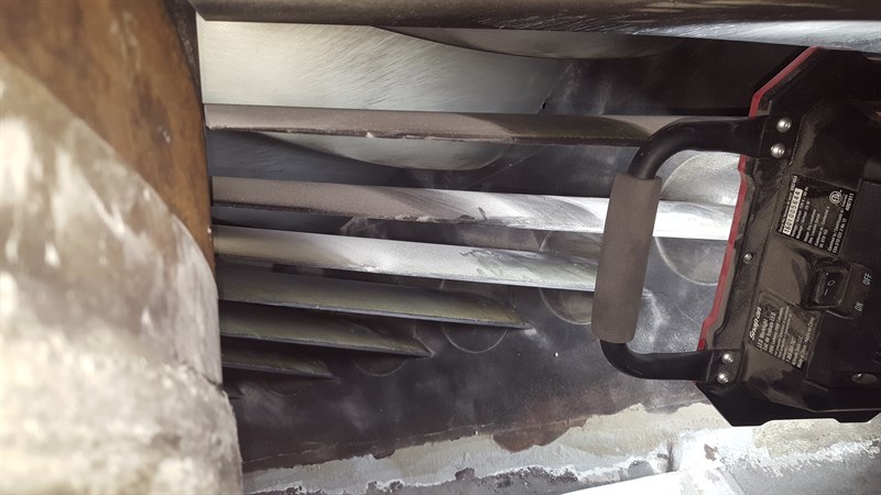The entire inlet scroll and bellmouth were blasted to a near white metal stadard. A stripe coat to all welds and seems was hand-applied and then a top coat of two coats of Belzona 5892 were installed.