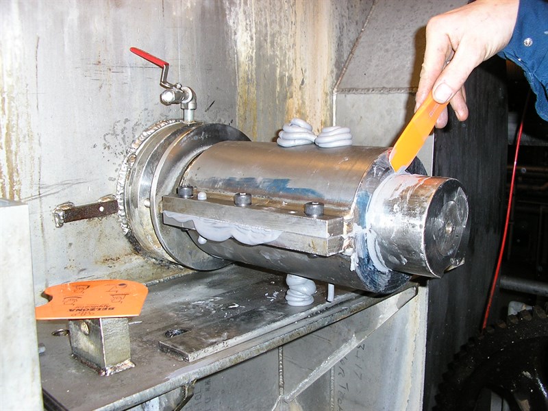 Previously this shaft had been welded up in position and the bearing seat area rough ground back to size. The shaft cannot be taken out without major strip down so an in-situ repair has to be done. The Belzona forming technique produced the precise required diameter.