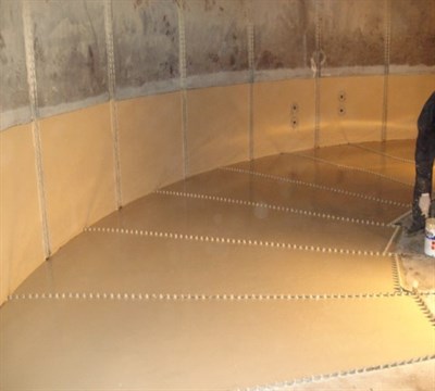 Belzona 1121 was used to fill in the pits of the localized damaged areas and plate bonding was used to restore any larger damaged areas on the base of the tank. Once the structure of the tank had been restored, 2 coats of Belzona 5811 were applied to the lower section of the tank.