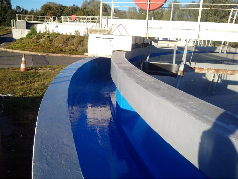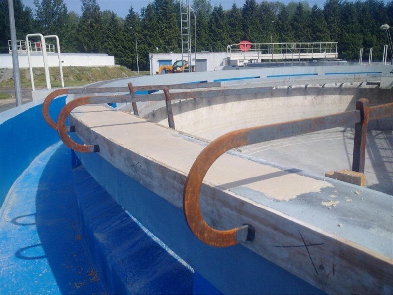 The broken parts of concrete on the roller track were taken away and the surface of both the track and the clarifier trough were prepared by scarification. Metal components were prepared by grit blasting. After the surface preparation, the concrete was rebuilt using Belzona 4111 with a trowel and a former when needed, in accordance with a modified version of Belzona Know-How System Leaflet TCC-09. The trough next to the roller track was protected with Belzona 5111. The floats and turbines were protected with Belzona 5811.