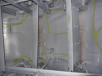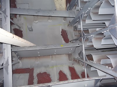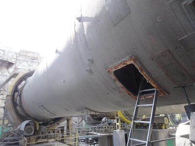 Problem: The rotary dryer (15 m long and 3.6 m diameter) is used for slag drying. The drying cylinder has an angle against the horizontal level and rotates while running. After putting the slag into one end of the rotary dryer, the slag is dispersed uniformly and forms a material curtain in the cylinder to contact the hot air (100ºC), which acts like a heat exchanger to achieve slag drying. In the area where the lifting flights are installed onto the interior of the dryer, the slag erodes the steel, eating away up to 15 mm of the metal from the original 20 mm thickness of the shell.