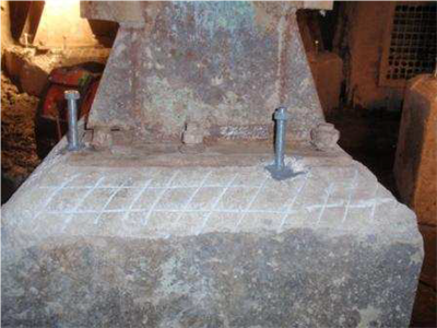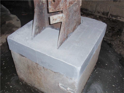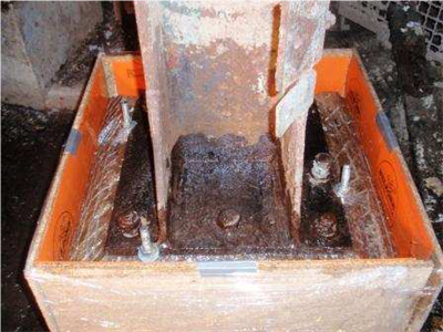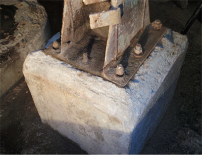 Problem: The five feet of a paper mill pulper and the concrete blocks underneath were badly damaged. The bolts keeping the feet in place on the concrete blocks were badly corroded. The whole equipment was no longer resting safely on the concrete base.
