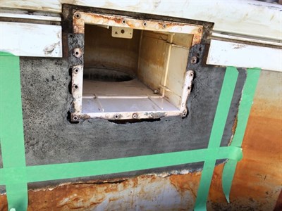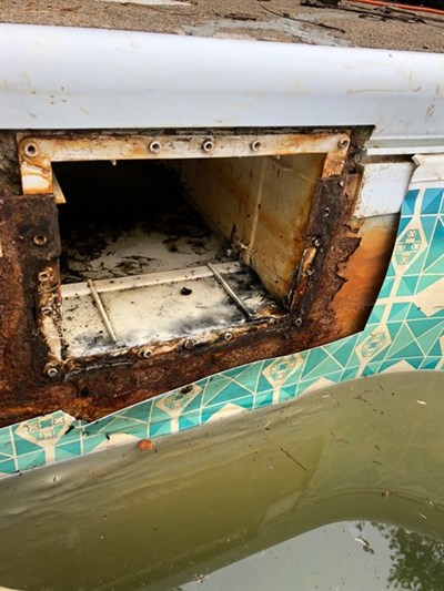 Before photo showing extent of corrosion around skimmer housing.
