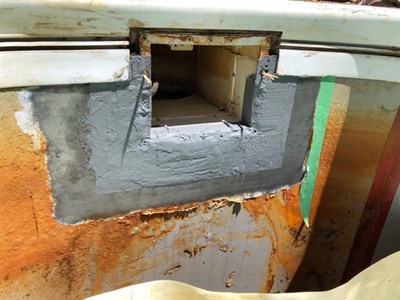 6" around the plastic skimmer housing was marked to define the repair areas. These areas were bristle blasted to remove loose paint and rust, and to provide a suitable anchor profile. The repair areas were then cleaned with Methyl Ethyl Keytone (MEK) to remove all contaminants. The repair areas were re-taped 3" around the skimmer housings before beginning the metal repair. Belzona 1161 was then brushed into the steel substrate and plastic skimmer housings. Additional Belzona 1161, wetted into Belzona 9341 Reinforcement Tape, was used to re-build the metal loss and bridge the void between the steel backing plate and skimmer housings. Once Belzona 1161 was allowed to cure, Belzona 3121 (MR7) was applied over the entire repair areas, as two coats, preventing any future water ingress.