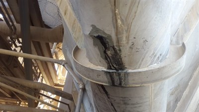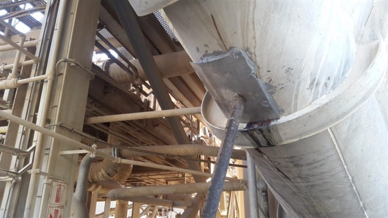 The application was carried out in accordance with Belzona System Leaflet VPF-1. At the top of the chute, a through-wall defect had emerged. A 3mm-thick stainless steel plate was rolled to shape and bonded in place over the defect using Belzona 1111 (Super Metal). This was supported by a metal pole to keep the plate in place during cure. In addition, a drain valve at the bottom of the shoot had developed a through-wall defect. This was repaired also using paste-grade Belzona 1111. Finally, both repairs were then fully encapsulated with Belzona 1341 (Supermetalglide).