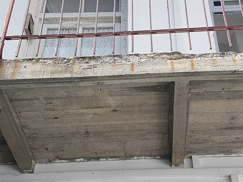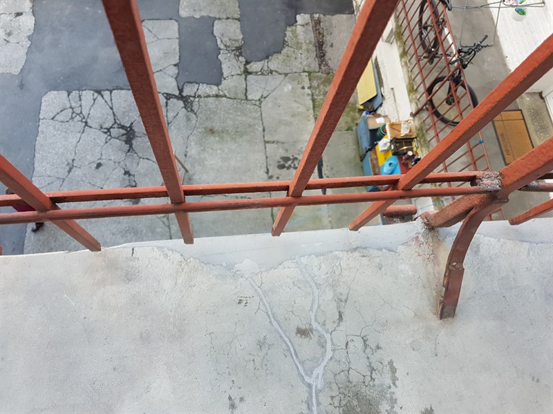 Problem: The balconies were repaired 30 years ago. Due to age, carbonation of concrete, exposure to rain/snow and water ingressing into cracks, at the edge of balconies the pieces started to fall down. This was a safety hazard for people walking beneath.