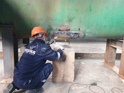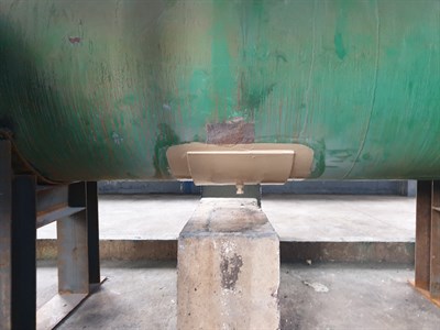 Supports were erected at either side of the original pipe support. The live leak was then plugged at the various locations using Belzona 9611 in order to divert the leak to one single area. A 10mm plate with a threaded outlet was then cold bonded using Belzona 1212 due to it's very short polymerisation window and held in place using a strap. Once fully cured, a threaded screw was threaded into the plate to stop the leak, followed by 2 coats of Belzona 5811 applied over the plate to prevent any corrosion occurring again in the area. The application was carried out in accordance with modified version of Belzona System Leaflet VPF-11.