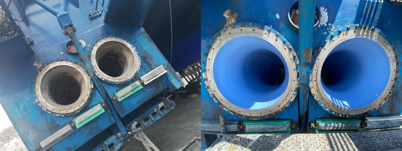 Application is carried out in accordance with Belzona Know-How System Leaflets SOS-1 & 2. Surface was prepared according to ISO 8501-1 Sa 2,5. All the areas suffering from pitting, cracking and metal loss, were rebuilt with Belzona 1311. Finally, two coats of Belzona 1341 were applied to the whole internal surface of the Jet Tubes,in order to provide erosion protection & water flow optimisation.