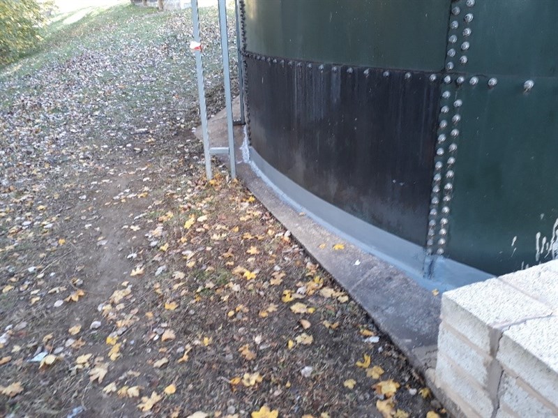 The leaks were plugged with wooden wedges to stem the flow. The areas around the leaks were then repaired with Belzona 9611 (ES-Metal). When the area was sealed, the wooden wedges were cut flush with the tank wall. They then bonded over the entire failed areas with Belzona 1111. Finally, when the Belzona 1111 had cured a bolt was screwed in, sealing the leaks. Belzona 1111 was also applied in a 75mm band around the base of the tank, incorporating reinforcing sheets, to seal the multiple leaks around the base. This was completedin accordance with Belzona system leaflet TCC-01.