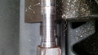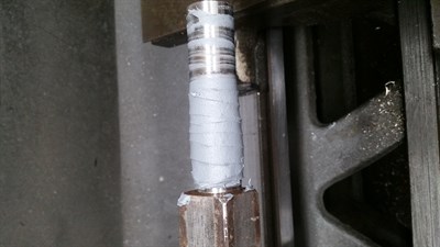 1) Shaft undercut and grooved in preparation for application Photo 2) Belzona 1111 build up completed Photo 3) Turning shaft back to original outer diameter Photo 4) Application completed and perfectly fit to a new bearing