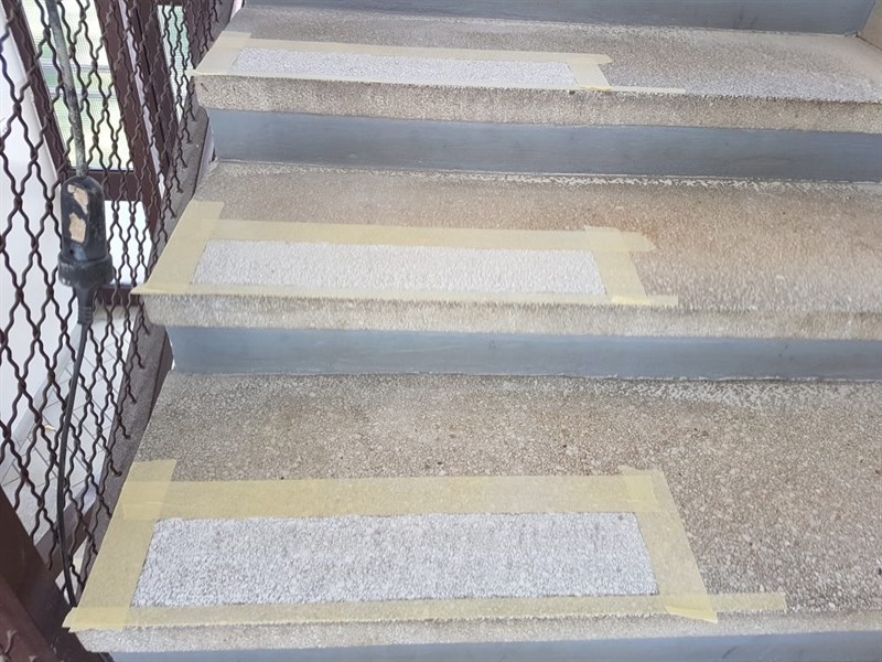 The customer had previously installed several types of cheap adhesive tapes which all lasted a very short time and didn’t perform well. Since this was an indoor application and the distributor knew that the price would be an issue. One coat of Belzona 5231 with Belzona 9221 (Sure-foot Aggregate) incorporated was recommended. 2 packages of Belzona 5231 (Dark Grey, 4 liters each) and 5 packages of Belzona 9221 (2 kg each) were used.