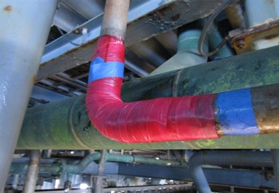 Problem: The problem was a pin hole leak that was found on a 2" pipe around the weld seam of an elbow, caused by external corrosion. This was an LDHI transfer line on an offshore platform in the Gulf of Mexico. Operating Temperature is 100F and Design Pressure of 150psi. A quick and compliant repair was desired by client to stop the leak and continue normal operations.