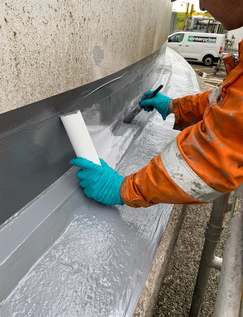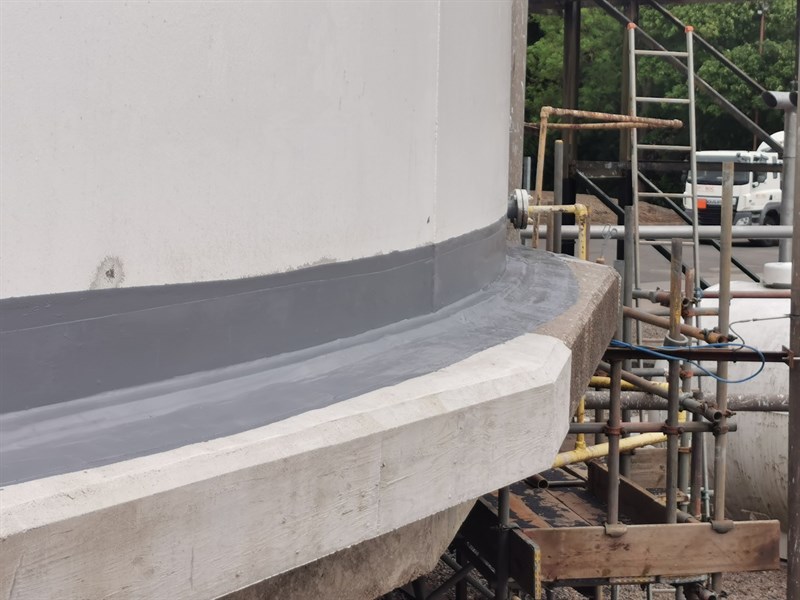 Once the substrate has been prepared to a standard of minimum surface profile of 75µm and a surface cleanliness of SA 2½, Belzona applicators rebuilt the damaged areas under the annular ring using Belzona 4131 to a 45° fillet which will encourage water flow away from the tank. Once complete the Belzona Tank Base Sealing system was applied in accordance with Know-How system leaflet GSS-03 using Belzona 3131 at a 500mm wide band around the complete circumference.