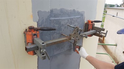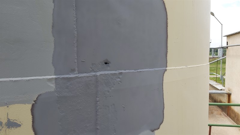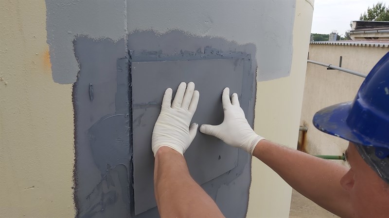 Application was carried out in accordance with Belzona Know-How System leaflet TCC-1. The surfaces (tank and plates) were abrasive blasted to prepare the area and Belzona 1111 was applied directly onto the prepared surface with a spatula.