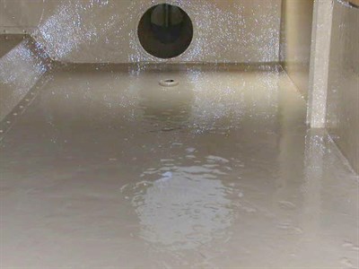 After postponing repairs for 4-5 years, the basin was leaking enough to force the issue. After surface preparation by grit blasting, there were many pin holes, but all were too small to allow the Belzona® 5811 to leak through so an impervious surface was achieved. Two cooling tower basins were protected in cold weather by placing heaters below the basin, and a tarpaulin across the top, so raising the interior temperature to 65°F (18°C).