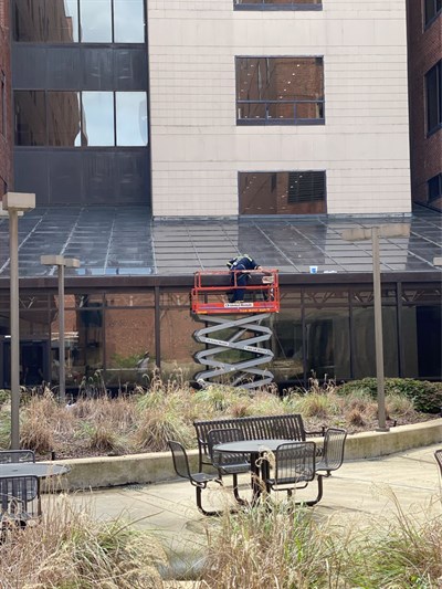Rainwater was filling the gutters and entering behind the flashing into the building.