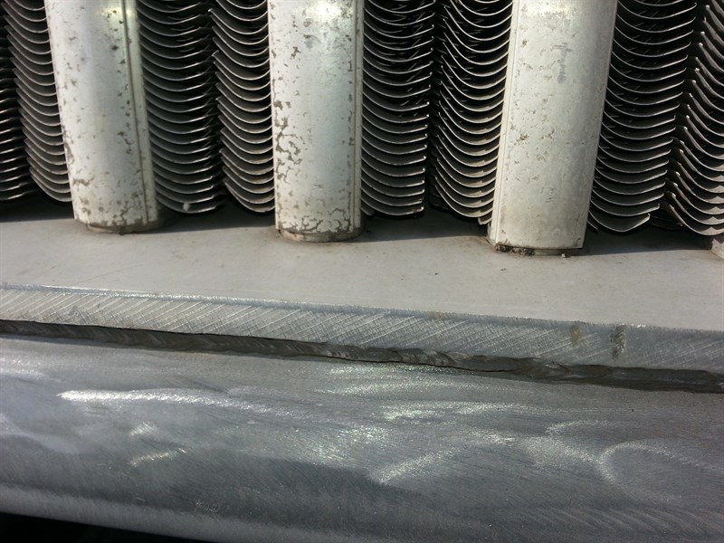 Vacuum condenser has aluminium construction. Source of the cracks on the welding seams is mechanical movement from temperature differences.