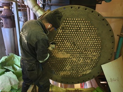 The application was carried out in accordance with Belzona System Leaflet HEX-01. The substrate was grit blasted and cleaned using Belzona 9111. All tubes on the tube sheet were corked - using over 6000 corks. The surface of each tube sheet was rebuilt back to it's original profile using Belzona 1511, a conical grinder was used to chamfer the product around each tube. Once rebuilt the tube sheet was coated using Belzona 1391T to prevent corrosion and chemical attack from the Hexane gas. Belzona 1391T is perfect for higher temperature applications such as these where the operating temperature was 120°C (up to 200°C - Dry Heat). Once the tube sheet coated the corks were drilled out and the tube sheet cleaned using compressed air.