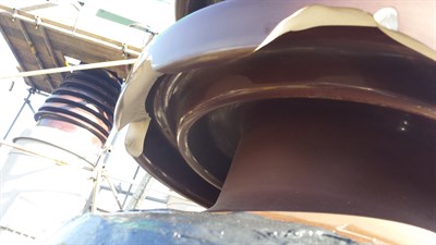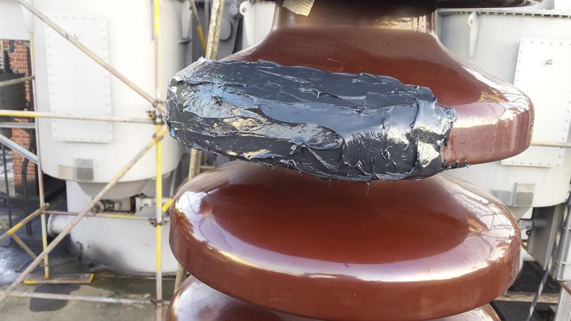 A mould of a sound area of the shed was created by applying Belzona 2211 after treating substrate with Belzona 9411 (Release Agent). Once the Elastomer mould had cured it was removed, Belzona 9411 applied inside before wetting out the damaged portion of the shed with Belzona 1111. More Belzona 1111 was applied to the damaged area of the shed before the mould was positioned to rebuild the shed profile. OnceBelzona 1111 had cured the mould was removed and a coat of Belzona 4311 was applied over the repair to colour match and to prevent arcing across the repair.