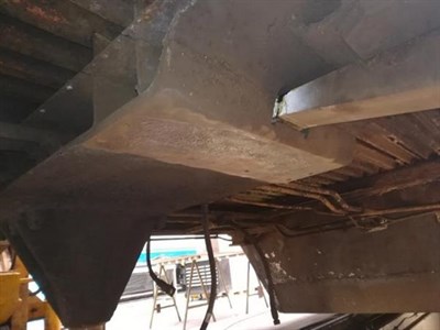 Problem: The greatest area of concern is the vehicle bolster structure as this exhibits the most damage and acts as the interface between the side bearers and the vehicle. Exfoliation corrosion has occurred between the body shims and the side bearer top plate mounting on the vehicle bolster structure. This has led to a particularly deep uneven surface caused by the wasting of the original plate thickness on the vehicle bolster. Given this area supports the side bearer, any flexing allowed in the side bearer assembly may have a detrimental effect to the ride quality of the vehicle and the wheel loading's.