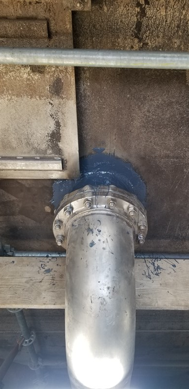 The first step was using hand tools much like a grinder with grinding disk and/or a pocketknife to clean the substrates. Then, B-1212 was applied to fill the small void between the concrete tank and stainless-steel pipe by pressing in the paste grade with a Belzona applicator. Following that, a chamfer was created around the 12” Diameter pipe and concrete gap by spreading it up the concrete wall 2” all the way around the pipe and out towards the flange a couple inches. Then, an additional B-1111 paste grade was added to build more material on top of B-1212 to create a thicker substrate along the pipe and to ensure the area is sealed. For added insurance and to give a good chemical resistance since B-1321 S metal is also an approved AB – Budweiser product to come into beer contact (even though this is a waste tank) we topped it off in 2 x coats of 1321 S metal to completely seal the paste grade for a stouter permanent repair.